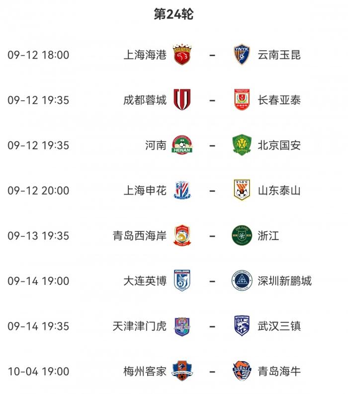 直播吧09月12日讯 中超重燃战火,前4球队今天纷纷出战,蓉城对阵倒数第一但进来状态不俗的亚泰,近5轮只拿到1胜的申花大战4连胜的泰山,海港主场迎战客场战绩糟糕的玉昆,国安客场挑战河南。