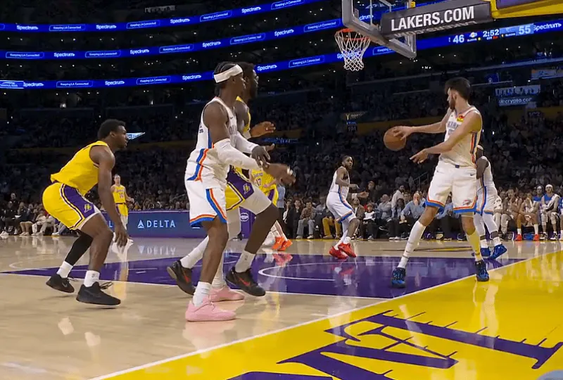 虎扑04月08日讯 NBA常规赛,湖人对阵雷霆的比赛正在进行中。